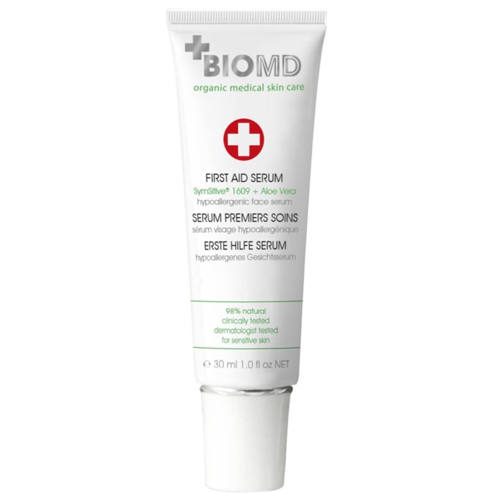 BioMD First Aid Serum är ett hypoallergent ansiktsserum som återfuktar huden. Serumet innehåller den aktiva ingrediensen SymSitive® 1609 som kan bidra till att minska besvär hos hypersensitiv hud såsom en brännande eller stram känsla i huden. Med citronsyra som bidrar till att jämna ut hudtonen och kan lösa upp tilltäppta porer och göra huden klarare.