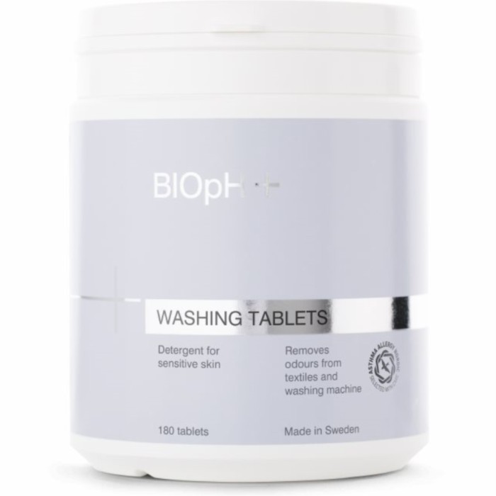 BIOpH Washing Tablets är ett högkoncentrerat tvättmedel i tablettform. Effektiv för alla typer av textilier, även känsliga material. (Dock ej för siden.) Kan användas för tvätt av träningskläder, strumpor och underkläder. Tvätttabletterna bryter effektivt ned dålig lukt i både textilierna och tvättmaskinen redan vid 30°C. Parfymfritt.