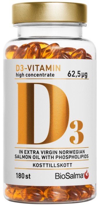 BioSalma D3-vitamin High Concentrate är ett kosttillskott med en hög koncentration D-vitamin 62,5 mikrogram. D-vitaminet är löst i laxolja som bl a innehåller fosfolipider för att förbättra upptaget av det fettlösliga D-vitaminet.