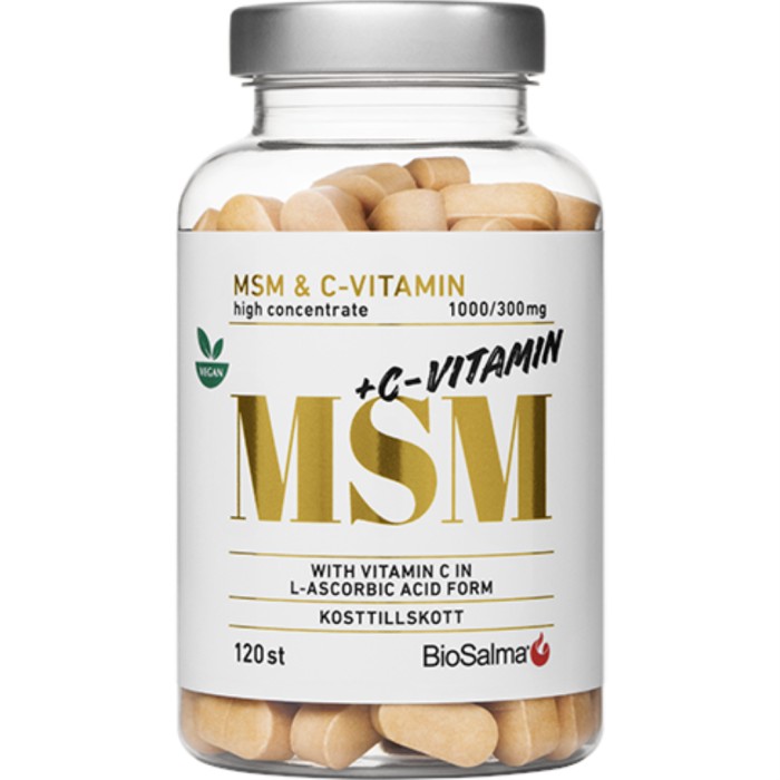 BioSalma MSM + Vitamin C är ett kosttillskott med MSM och C-vitamin. MSM (Metylsulfonylmetan) är ett organiskt svavel. Svavel utgör ca 0,25% av vår totala kroppsvikt och finns i kroppens alla vävnader, mest i proteiner som bygger upp bindväv hår hud och naglar. BioSalma MSM innehåller C-vitamin som bidrar till normal kollagenbildning. Vegansk.