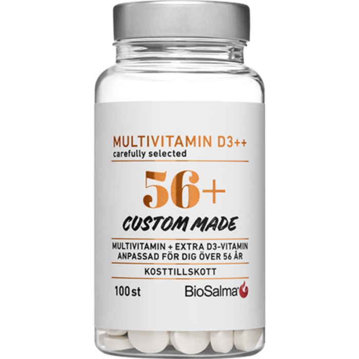 BioSalma Multivitamin 56+ D3++ är ett kosttillskott framtaget för personer 56+. Detta kosttillskott är en multivitamin som innehåller bland annat D3-vitamin. Rekommenderad daglig dos: 1-2 tabletter.