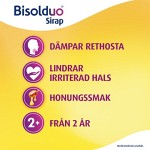 Bisolduo Sirap lindrar rethosta och irriterad hals genom att lugna slemhinnan i mun och svalg. Bisolduo Sirap behandlar rethostan lokalt och ger snabb lindring.