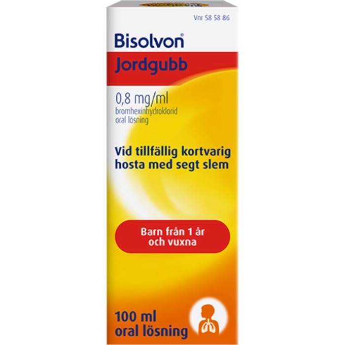 Bisolvon Jordgubb hostmedicin är ett receptfritt läkemedel som används vid tillfällig kortvarig hosta med segt slem (slemhosta). Bisolvon hostmedicin anses lösa upp segt slem så att det blir mer tunnflytande och därmed lättare att hosta upp. Bisolvon innehåller det aktiva ämnet bromhexin. Läs bipacksedeln noga före användning.