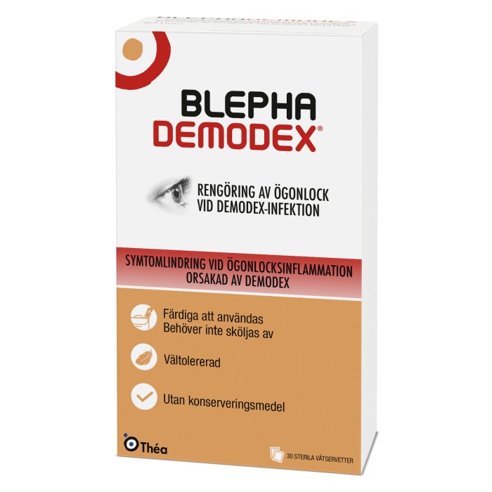 1. Öppna förpackningen och veckla ut servetten. 2. Placera servetten på toppen av pekfingret och vira den runt fingertoppen. 3. Stäng ögat och håll det stängt. Lägg fingret med servetten mot ögonlocket och massera försiktigt med små cirkulära rörelser för att rengöra basen av ögonfransarna (övre och nedre) och få bort krustor, mjäll och sekret. 4. Ta en ny servett och upprepa på andra ögat. Efter den fyra veckor långa behandlingen med Blephademodex rekommenderas att du fortsätter att göra rent dina ögonlock dagligen.