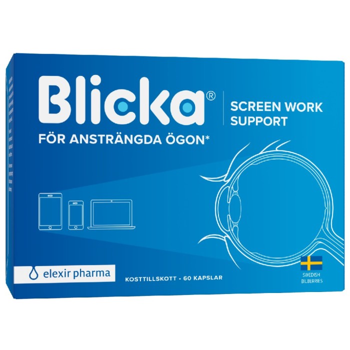 Blicka är ett kosttillskott som innehåller omega3-olja från norsk sej (rik på DHA), naturligt betakaroten (A-vitamin), blåbärsextrakt från svenska blåbär, lutein & zeaxantin från ringblomma, ekologisk astaxantin, rutin & quercetin från bovete samt barkextrakt från silvergran. DHA och vitamin A bidrar till normal synförmåga. Vitamin A bidrar även till att bibehålla normala slemhinnor.