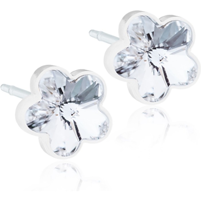 Blomdahl MP Flower Crystal är blomformade örhängen i ren medicinsk plast med klar kristallsten. De är så lätta att du kan använda dem dagligen. Örhängena levereras i en så kallad Clean Pack som förvarar smycket hygieniskt tills du öppnar förpackningen. Etiketten fungerar som ett sigill.