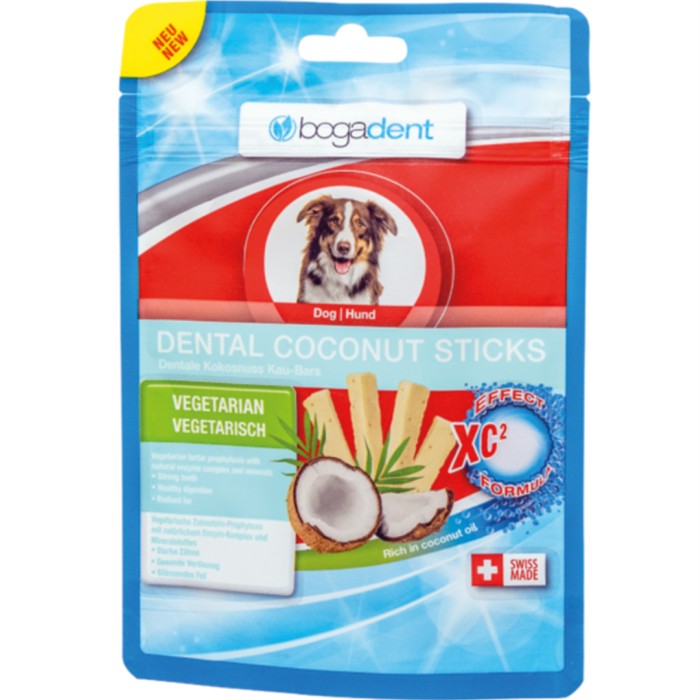 Bogadent Dental Coconut Sticks tuggpinnar för hund är vegetariska tandvårdsbars gjorda med kokosflingor och kompletterade med naturliga enzymer från koncentrerat vassleprotein och mineraler. Detta - tillsammans med den triangulära formen - hjälper till att minska uppbyggnaden av tandsten och bidrar till att bibehålla friskt tandkött. Dessutom stärker kokosoljan hundens päls och hud.