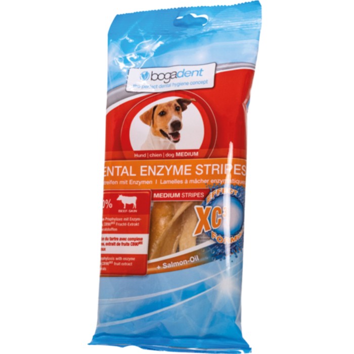 Bogadent Dental Enzyme Stripes Medium är råhudstugg till hund, med naturliga enzymer från koncentrerat vassleprotein, tranbär och mineraler. Kan minska uppbyggnaden av tandsten och bidrar till att bibehålla ett friskt tandkött. Den speciella råhudsstrukturen hjälper också till att mekaniskt minska plackuppbyggnaden genom tuggning.