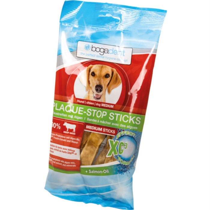 Bogadent Plaque Stop Sticks Medium tuggpinnar till hund innehåller tång, tranbär, klorofyll och mineral för att minska uppbyggnaden av tandsten och kan bidra till att bibehålla friskt tandkött. Den speciella råhudsstrukturen hjälper till att mekaniskt minska plackuppbyggnaden genom tuggning.