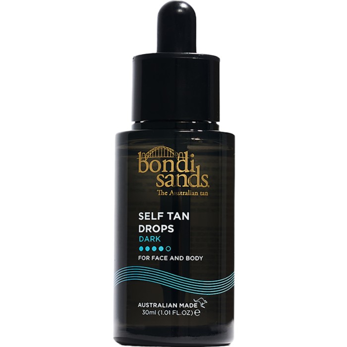 Bondi Sands Dark Self Tan Drops är berikade med australiska växter för att ge huden näring och glow. Dermatologiskt testad, icke-komedogen (täpper inte till porer) och passar känslig hud. Formuleringen är fri från parfym och färgämnen.