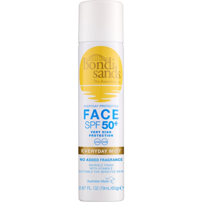Bondi Sands SPF 50+ Everyday Face Mist är en mild solskyddsspray för ansiktet, som snabbt går in i huden. Everyday SPF 50+ Face Sunscreen Mist skyddar mot solens UVA- och UVB-strålar och torkar till en osynlig finish. Innehåller vitamin E och hjälper till att hålla huden återfuktad. Kan användas över smink. Dermatologiskt testad. Lämplig även för känslig hud. Icke-komedogen, dvs täpper inte till porerna.