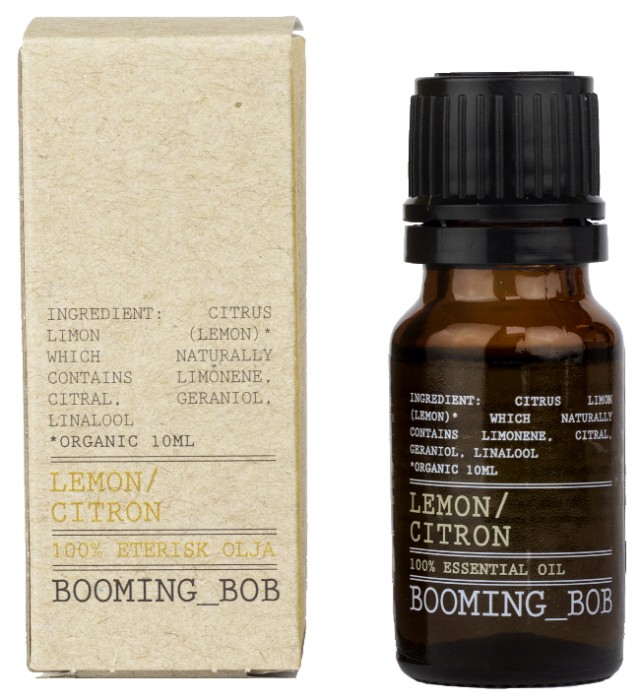 Booming Bob Essential Oil Citron är en citrusdoftande eterisk olja, utvunnen ur citronskal. Inom aromaterapi anses citron vitaliserande och stödjande för koncentrationsförmågan. I hudvård anses den sammandragande och renande.
