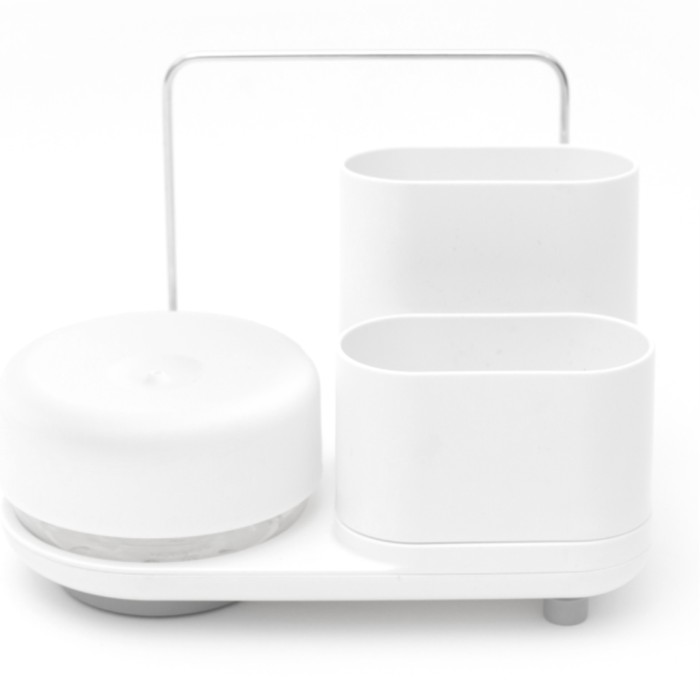 Bosigns förvaringsställ är en smart lösning för att hålla din diskbänk mer organiserad. I stället ryms en diskmedelspump och förvaring för disktrasa, disksvamp och diskborste i ett och samma ställ, så att du har allt du behöver för att diska och rengöra din köksyta. Fyll diskmedelspumpen med diskmedel och lite vatten. Tryck sedan bara diskborsten eller disksvampen på locket, så får du rätt mängd diskmedel. Lätt att rengöra, då en dold bricka samlar upp överflödigt vatten som lätt töms via dräneringshålet på sidan av bricka.