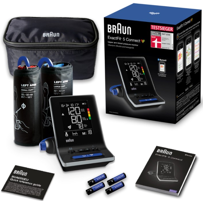 Braun ExactFit™ 5 Connect är en automatisk blodtrycksmätare som används på överarmen. Braun ExactFit 5 Connect har en extra stor färgskärm (XL) och gör det enkelt att övervaka ditt blodtryck på egen hand. Blodtrycksmätaren har två manschettstorlekar (S/M och L/XL) att välja mellan för bästa passform och för att ge en så exakt läsning som möjligt. Mätaren använder en mjuk inflationsteknik för en bekväm mätning, vilket kan vara bra för dig som behöver ta regelbundna mätningar.