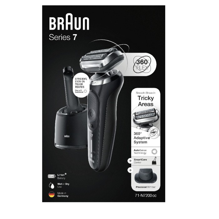 Braun Series 7 rakapparat för män med 360° anpassning för en smidig rakning, även i svåråtkomliga områden. Rakapparaten är effektiv på alla typer av skägg och använder en AutoSense-teknik som läser av och anpassar sig efter skäggets täthet. Litiumjonbatteriet ger upp till 3 veckors rakning (50 minuter) och 5 minuters snabbladdning räcker till en rakning.