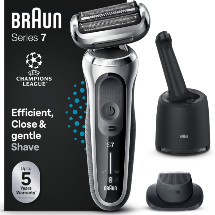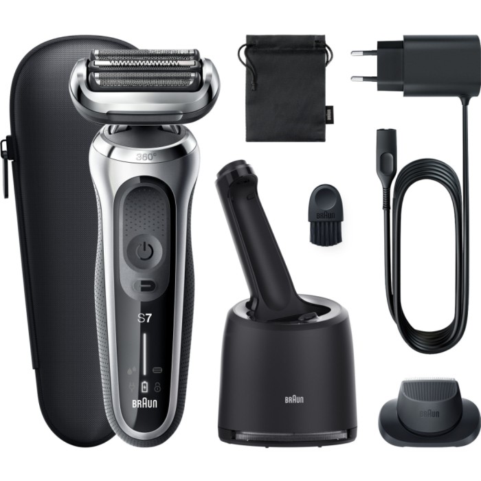 Braun Series 7 rakapparat Wet & Dry för män med 360° anpassning för en smidig rakning. Med AutoSense-teknik som läser av och anpassar sig efter skäggets täthet, och tar fler hårstrån i varje rakning. Litiumjonbatteriet ger upp till 3 veckor av rakning och apparaten har en 5-minuters snabbladdning. Med Easyclick precisionstrimmertillbehör. Laddningsbar (sladdlös användning).