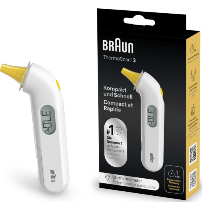 Braun ThermoScan 3 IRT 3030 är en digital örontermometer som blixtsnabbt mäter temperaturen. Passar för hela familjen, men den snabba mättiden gör den extra lämplig för att ta temperaturen på barn som inte vill sitta still. Termometerns display visar temperatur och har ljudsignal som indikerar feber under mätningen.