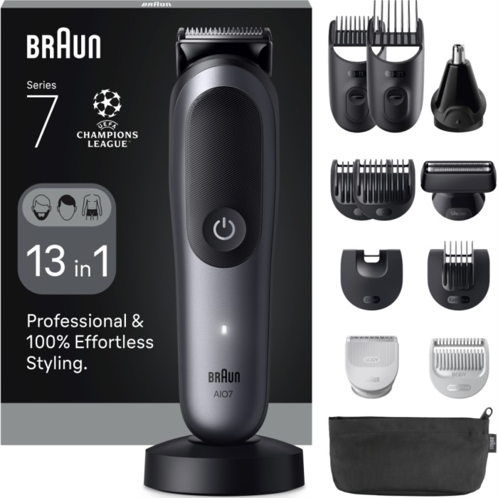 Groomingkit Series7 som Brauns kallar sitt bästa All-in-One Grooming kit för män. Detta 13i1-kit gör det enkelt att trimma skägg, öronhår och näshår, och klippa håret och trimma på kroppen. Med Ultra Sharp ProBlade för precision på alla typer av skägg med AutoSense-teknologin. Ger en exakt rakning och perfekta linjer med PrecisionShave-huvudet. Har 14 längdinställningar och AquaGrip för användning under vatten (vattentät). Har upp till 120 minuters drifttid med Li-Ion-batteri.