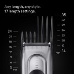 Innehåll: Braun hårklippare, 2 st kammar (3–24 mm, 14-35 mm), 1 st laddningsställ, 1 st påse, 1 st rengöringsborste.