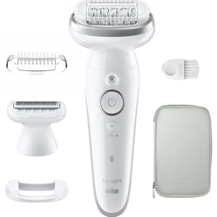 Braun Silk-épil 9 (modell 9-041) är en epilator som ger upp till en månads slät hud. Denna epilator från Braun använder en MicroGrip-pincetteknik som fångar upp hårstrån som inte kan vaxas (så korta som 0,5 mm). Silk-épil 9 Flex 3D ger len hud och har ett helt flexibelt huvud, som gör det lättare att komma åt även på svåråtkomliga områden som knän och armhålor. Anpassar sig efter dina konturer och gör hårborttagningen enkel. Det breda huvudet täcker ett stort område för hårfri hud med några få drag. Du kan justera trycket mot huden för att enkelt växla mellan effektläge och skonsamt läge med Smart Touch. Laddbar epilator som används sladdlöst, utformad för att vara bekväm att använda. Denna modell är en Wet & Dry och kan användas i badet eller duschen. Vissa upplever att det gör mindre ont om man epilerar i badet/duschen under varmt vatten. Inkluderar lady shaver-huvud och trimmerkam för känsliga områden.