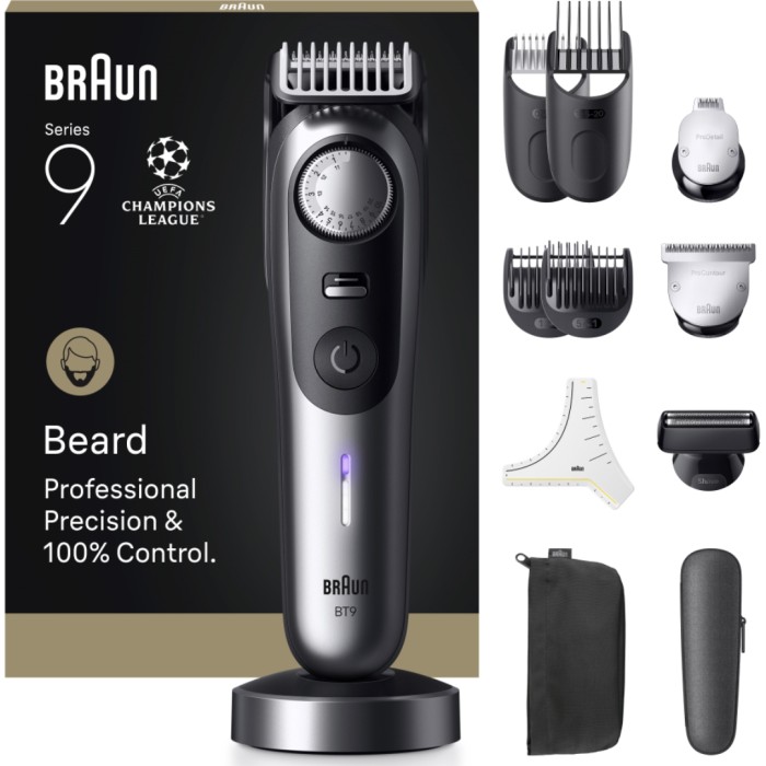 - Professionell precision: Series 9 låter dig trimma, raka, definiera kanter och detaljer med premium barberarverktyg för perfekta linjer, mjuka övergångar och jämn finish