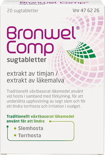Bronwel Comp Sugtabletter är ett växtbaserat läkemedel som används vid hosta i samband med förkylning. Bronwel Comp Sugtabletter används för att underlätta upphostning av segt slem och för att lindra irritation i munhåla och svalg. Med extrakt av timjan och läkemalva.