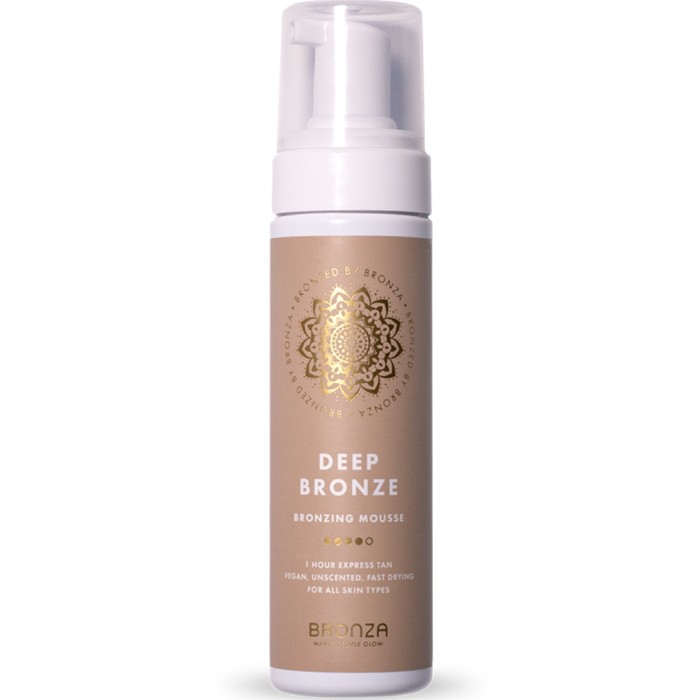 Bronza Deep Bronze Bronzing Mousse ger en gyllene, djup bronze-nyans till din hud på bara 1 timme. Deep Bronze Bronzing Mousse ger huden lyster och ett solkysst utseende utan att du behöver vara i solen. Den lättapplicerad och snabbaktiverande self-tanning moussen kan användas till både ansikte och kropp. Moussen fördelar sig jämnt över huden och kan duschas av redan efter 1-6 timmar. Deep Bronze är berikad med närande oljor och vitaminer som återfuktar och ger huden glow.