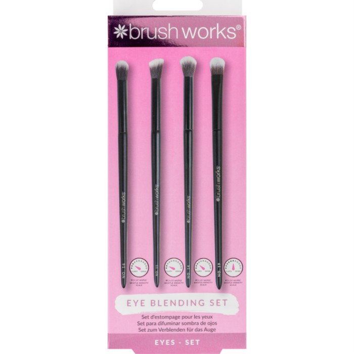 Brushworks Eye Blending Set för ögonmakeup är ett set som innehåller fyra borstar: No. 16 Tapered Blending Brush, No. 15 Angled Blending Brush, No. 14 Fluffy Blending Brush och No. 19 Crease Brush. Var och en av borstana är utvald för att tillgodose ett steg i din ögonskuggsrutin.
