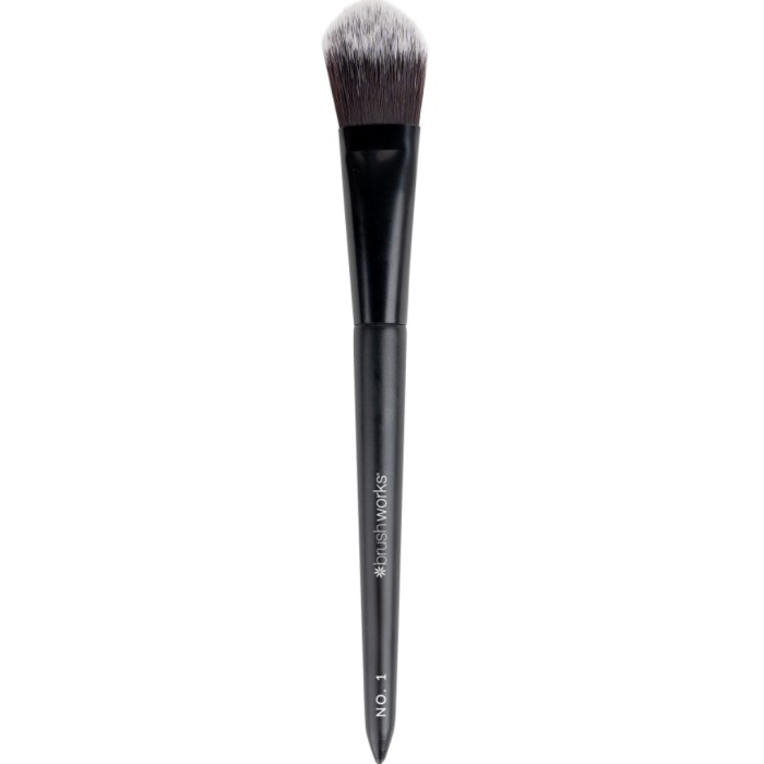Brushworks No. 1 Foundation Brush är ett sminkverktyg som hjälper dig att enkelt skapa en felfri bas. Denna platta foundationborste är utformad för att ge en sömlös applicering av både kräm- och flytande produkter, för att säkerställa en jämn och airbrushad finish. De supermjuka taklonborsten gör att produkten glider på smidigt och jämnt, samtidigt som borsten är skonsam mot huden.