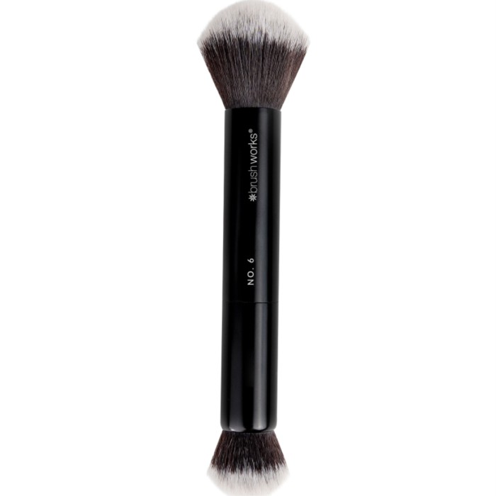 Brushworks No. 6 Double Ended Powder & Buff Brush har en design med dubbla ändar som kombinerar en puderborste och en poleringsborste. Dessa två borstar ger en sömlös applicering och enkel blandning av dina kräm-, flytande- och puderprodukter.