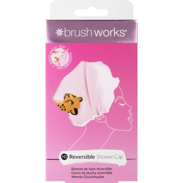 Brushworks Reversible Shower Cap är en vändbar duschmössa med leopardmönster. Duschmössan har en mjuk mikrofibersida som är skonsam mot håret, och den vattentäta sidan håller håret torrt i duschen.