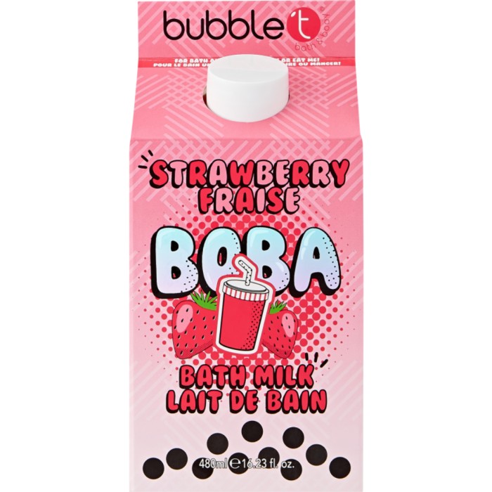 Boba Strawberry Bath Milk från BubbleT är en badtvål med en jordgubbsdoft som ger ett mjukt skum. Kanske perfekt när du vill ta ett avkopplande bad och en välförtjänt paus i vardagen. BubbleT badtvål är berikad med glycerin och aloe vera-extrakt som tillför fukt och ger en mild rengöring.
