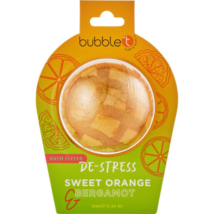 De-stress Sweet Orange & Bergamot Bath Fizzer är en badbomb med doft av söt apelsin och bergamott från BubbleT. Kanske perfekt för att koppla av med ett avslappnande bad. Njut av den friska, energigivande aromen och en mjuk och fräsch hud. Badbomben ger färg till badvattnet.