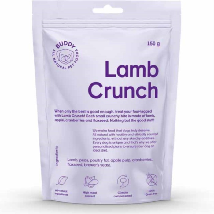 Buddy Pet Foods Lamb Crunch är hundgodis med lamm och tranbär. Lamm kan vara ett lättsmält protein och snällt mot magen. Gjort på naturliga ingredienser. Passar bra som belöningsgodis. Passar alla vuxna hundar och valpar. Enkelt att dela i mindre bitar.
