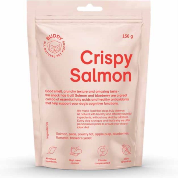Crispy Salmon Snack från Buddy Pet Foods är hundgodis med lax och blåbär, rikt på omega-fetter, protein och antioxidanter. Gjort på naturliga ingredienser. Passar både till vardags och träning. Passar alla vuxna hundar och valpar. Enkelt att dela i mindre bitar.