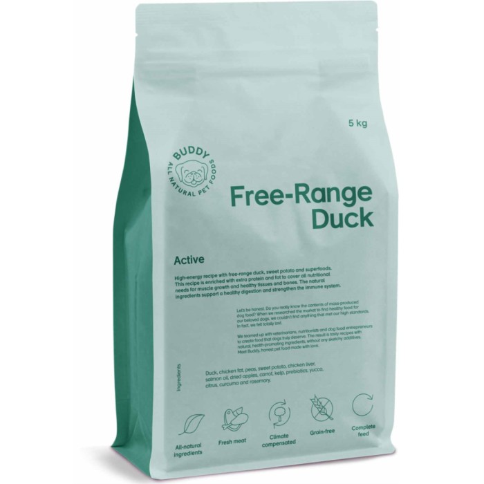Buddy Pet Foods Free Range Duck är ett högenergifoder för stora och aktiva hundar med god smakacceptans. Fodret innehåller anka, sötpotatis och andra ingredienser för att täcka näringsbehov för muskeltillväxt, frisk vävnad och ben. Receptet är berikat med extra protein och fett. Bitarna har en rund platt form ca 1,2-1,6 cm. Fritt från tillsatser, spannmål och gluten.