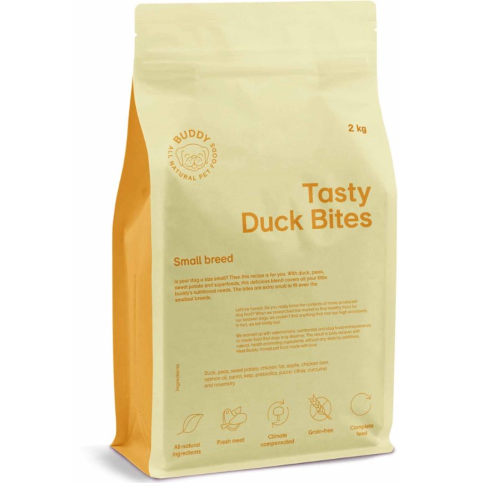 Buddy Pet Foods Tasty Duck Bites är ett helfoder anpassat för mindre hundar eller hundar som föredrar mindre foderbitar. Tasty Duck Bites är baserat på anka, ärtor och sötpotatis och har ett recept som ger näring till hunden. Bitarna är extra små (0,5 - 0,7 cm) för att passa även de minsta hundraserna. Fritt från tillsatser, spannmål och gluten.