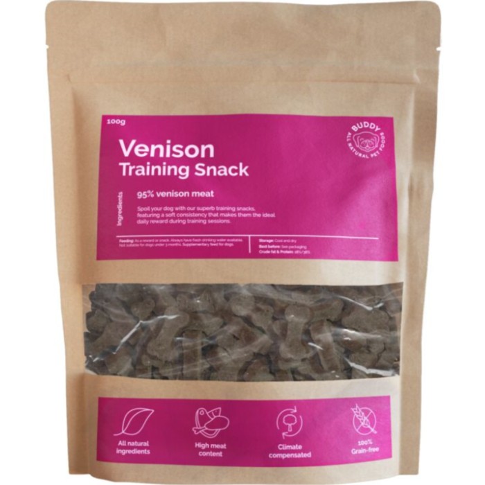 Venison Training Snack från Buddy Pet Foods är hundgodis till träning. Små bitar av rådjurskött där varje bit är mjuk och mäter ungefär 1,8 cm för att vara lätt att hantera.