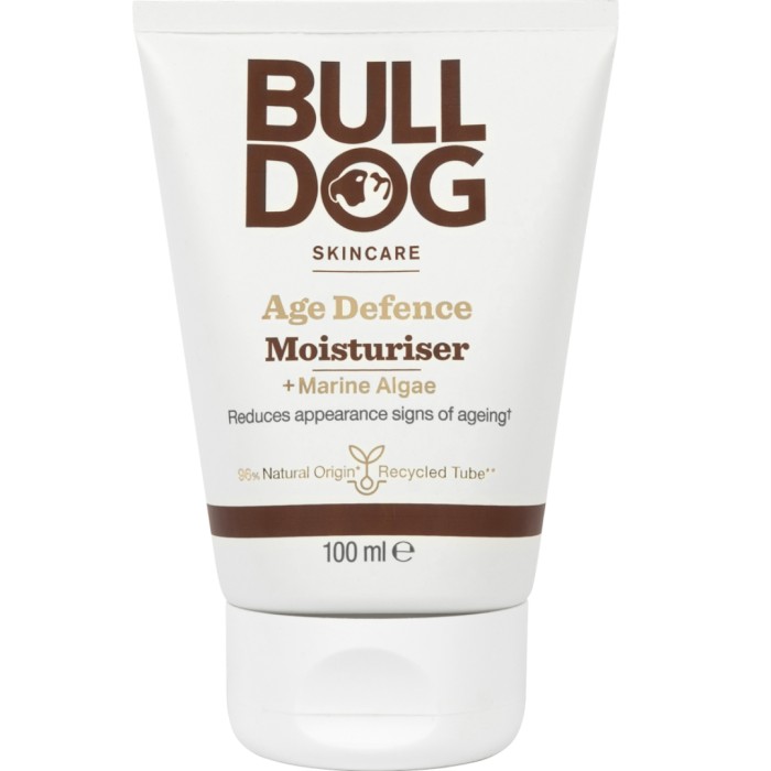 Bulldog Age Defence Moisturiser är en fuktighetskräm för män, med 96 % naturliga ingredienser. Den är kliniskt bevisad att minska uppkomsten av fina linjer och rynkor*. Produkten innehåller marin alg, en aktiv ingrediens, rik på antioxidanter med återfuktande och uppstramande egenskaper.