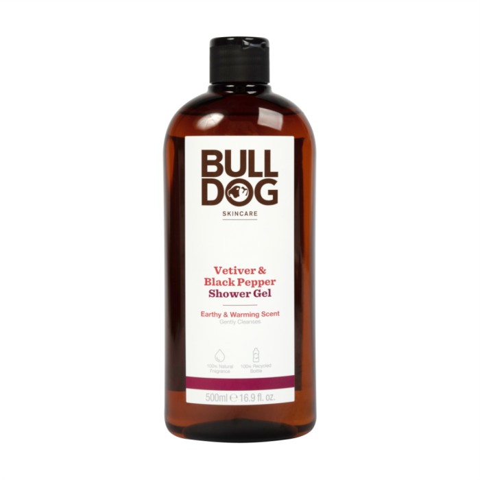 Bulldog Vetiver & Black Pepper Shower Gel är en duschgel med en varm och kryddig doft som tar hand om dig efter en lång dag. Kommer i en rymlig flaska om 500 ml som är lätt att öppna och gjord av 100% återvunnet material. Produkten är vegansk och gör rent utan att torka ut huden. Denna duschgel med en varm och kryddig doft rengör huden och tar hand om dig och efter en lång dag. Kryddig och aromatisk, med noter av färsk apelsin, svartpeppar, kryddnejlika, vetiver och patchouli.