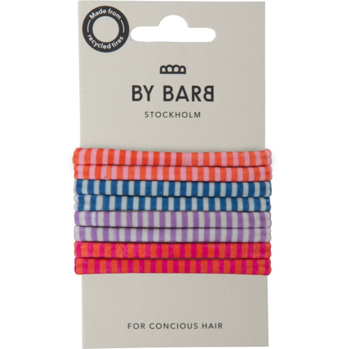 ByBarbs randiga hårsnoddar i fyra härliga färgkombinationer. Blir lika fina i håret som på handleden. Snoddarna sitter skönt och passar de flesta hårtyper. En bra produkt att ha hemma i "hårgarderoben". Tillverkad av återvunnen polyamid (BLUFIBRE®).