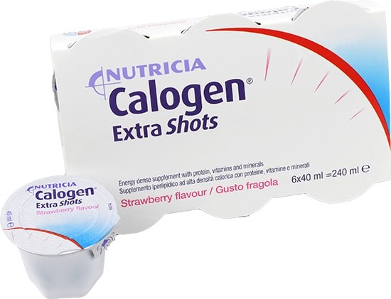 Calogen Extra Shots är en fettemulsion som är mycket rik på energi och som dessutom innehåller protein, kolhydrater, vitaminer och mineraler. Calogen Extra är lätt att inta då den endast skall ges i små doser, förslagsvis 30-40 ml vid 3 tillfällen per dag. Denna dosering ger förutom näring ett rejält tillskott på energi, hela 360-480 kcal.