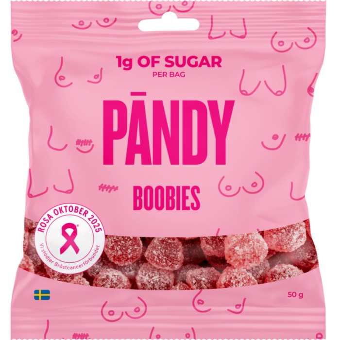 Pändy Boobies är framtagen för att bidra till Rosa Oktober 2024, för att sprida kunskap och samla in pengar till Bröstcancerförbundet. För varje såld påse skänker Pändy 2 kr till Bröstcancerförbundet. På baksidan av påsen hittar du en QR-kod som beskriver hur du bäst undersöker dina bröst – tidig upptäckt räddar liv!