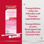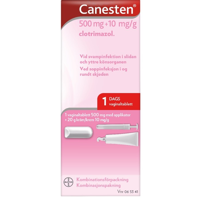 Graviditet, amning och fertilitet: Om du är gravid eller ammar, tror att du kan vara gravid eller planerar att skaffa barn, rådfråga läkare eller apotekspersonal innan du tar detta läkemedel. Dosering: Canesten 500 mg vaginaltabletter: 1 vaginaltablett förs in i slidan som engångsdos på kvällen. Vaginaltabletten ska införas i slidan så djupt som möjligt eftersom det krävs en viss fuktighet för att vaginaltabletten ska lösas upp. Behandlingen bör ske på kvällen strax före sänggåendet och utförs bäst i ryggläge med lätt uppdragna ben. Av praktiska skäl skall behandling inte ske under menstruation. De angripna områdena innefattar vanligtvis både slidan och de yttre könsorganen. De yttre könsorganen ska behandlas med Canesten 1 % kräm eller (1 % vaginalkräm) som stryks på tunt 2–3 gånger dagligen i 1-2 veckor tills 3 dagar efter att besvären försvunnit. Kontakta läkare om dina symtom blir värre eller om du inte blivit bättre efter 7 dagar. Använd alltid Canesten enligt läkarens anvisningar. Rådfråga läkare eller apotekspersonal om du är osäker. Canesten vaginaltabletter och kräm är luktlösa och missfärgar inte underkläderna.