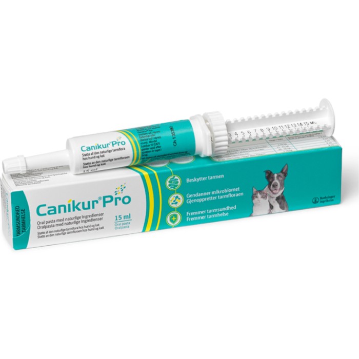 Dosera Canikur Pro med doseringssprutan. Vrid ringen på sprutans kolv till önskad dos och tryck ut pastan i matskålen eller direkt i djurets mun. Dosera enligt viktanvisning två gånger dagligen. Dosering Katt: 1-2 ml, 2 gånger dagligen Hund: Vikt < 10 kg, 2 ml två gånger dagligen Vikt 11-25 kg, 4 ml två gånger dagligen Vikt 26-40 kg, 6 ml två gånger dagligen Vikt > 40 kg, 8 ml två gånger dagligen