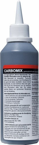 Förgiftningar: Kolmixturen skall ges snarast möjligt. Följande praktiska riktlinjer kan gälla för den första behandlingen i hemmet och på sjukhus. Vuxna och barn över 12 år: ca 150 ml (motsvarande ½ flaska á 50 g eller 1 flaska á 25 g Carbomix). Barn till och med 12 år: ca 60 ml (motsvarande 1/5 flaska á 50 g eller 2/5 flaska á 25 g Carbomix). Diarré: Vuxna och barn: 15-30 ml (1-2 matskedar) en till flera gånger dagligen. Bruksanvisning Flaskan fylls med vatten ungefär till det röda fältet i etikettens övre kant, ca 150 ml respektive 300 ml, korken tillslutes och flaskan omskakas väl i ungefär en minut varefter mixturen är färdig att användas. Öppna flaskan försiktigt och använd t.ex. en pappersservett till skydd, så att inte kläderna blir nedfläckade.