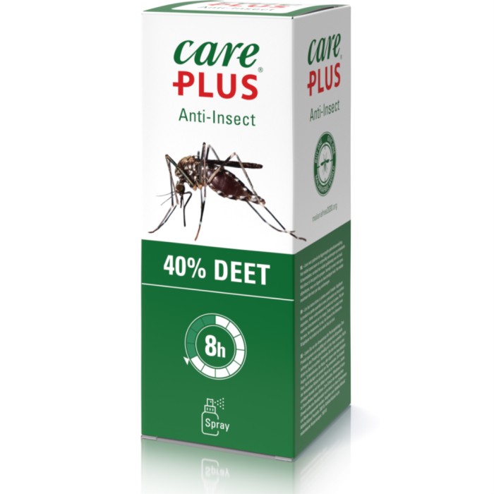 Care Plus Anti-Insect Deet 40% ger ett kraftfullt skydd mot mygg, knott och fästing. Sprayen innehåller 40% DEET och skyddar både mot tropiska och inhemska myggor. Använd max en gång per dag. Kan användas på vuxna och barn från 13 år.
