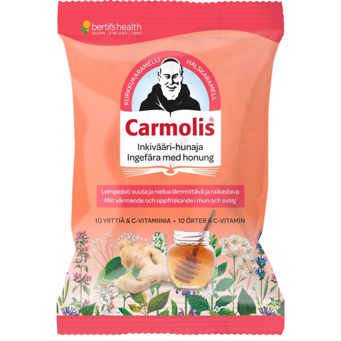 Carmolis Örtkaramell Ingefära med honung lindrar vid irriterad hals och verkar uppfriskande för mun och hals. Den lenande ört-karamellen innehåller eteriska oljor och är "spetsad" med stark ingefära samt har en mjuk kärna av honung.