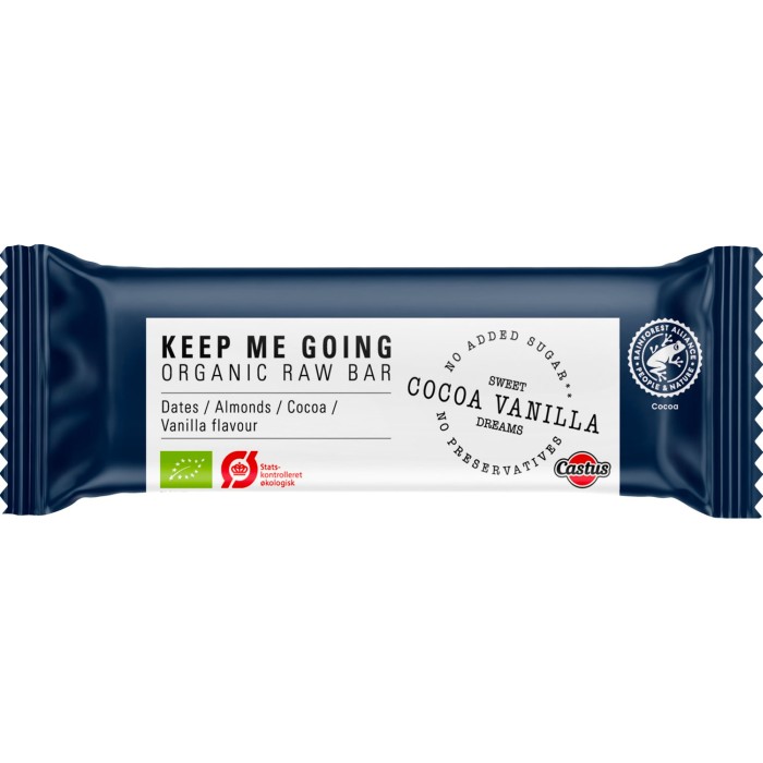 Keep Me Going Raw Bar Cocoa Vanilla är en ekologisk bar gjord på naturliga ingredienser, utan tillsatt socker. Denna bar har en smak av kakao och vanilj. Castus Keep Me Going-bar är rik på fiber. Vegansk.