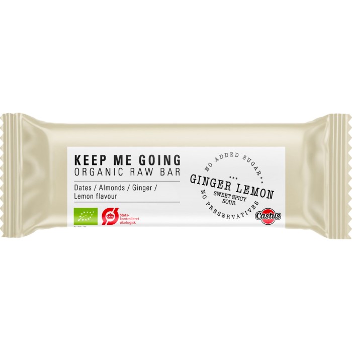 Keep Me Going Raw Bar Ginger Lemon är en ekologisk bar gjord på naturliga ingredienser, utan tillsatt socker. Denna bar har en smak av ingefära och citron. Castus Keep Me Going-bar är rik på fiber. Vegansk.